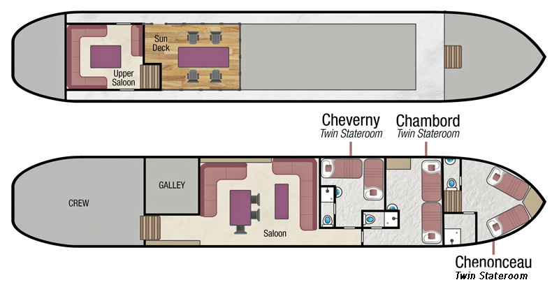 Chenonceau stateroom is accessed from the outside main-deck by 7 steps to the cabin below. There is a hand-rail.